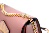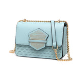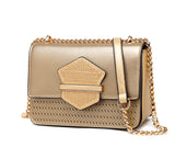 Step out in style with this chic mauve handbag featuring a sleek gold chain strap and intricate details. The bag boasts a stunning geometric front flap adorned with gold stud accents for a sophisticated touch, complemented by a textured woven pattern at the base. Perfect for casual outings or formal events, its compact yet spacious design ensures your essentials are always within reach. Crafted with premium materials, this handbag combines durability and fashion effortlessly. Add a versatile, luxurious accessory to your wardrobe today!