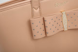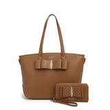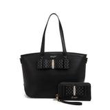 This sophisticated tote and wallet set is designed for those who appreciate timeless elegance with a modern twist. Featuring a sleek structured tote and a matching wallet, both adorned with a chic bow and sparkling rhinestone embellishments, this set is a perfect blend of luxury and functionality.
