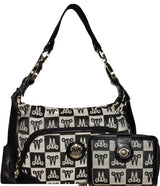 A stylish and functional shoulder bag featuring a monogram checkered print with a structured yet soft silhouette. The design includes a secure front pocket for added convenience.