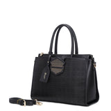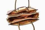 Crafted from premium vegan leather, this handbag features dual rolled handles and a detachable shoulder strap, giving you the freedom to carry it your way. The spacious interior keeps your essentials organized in style, while the sleek gold-tone finish adds effortless elegance to any outfit.